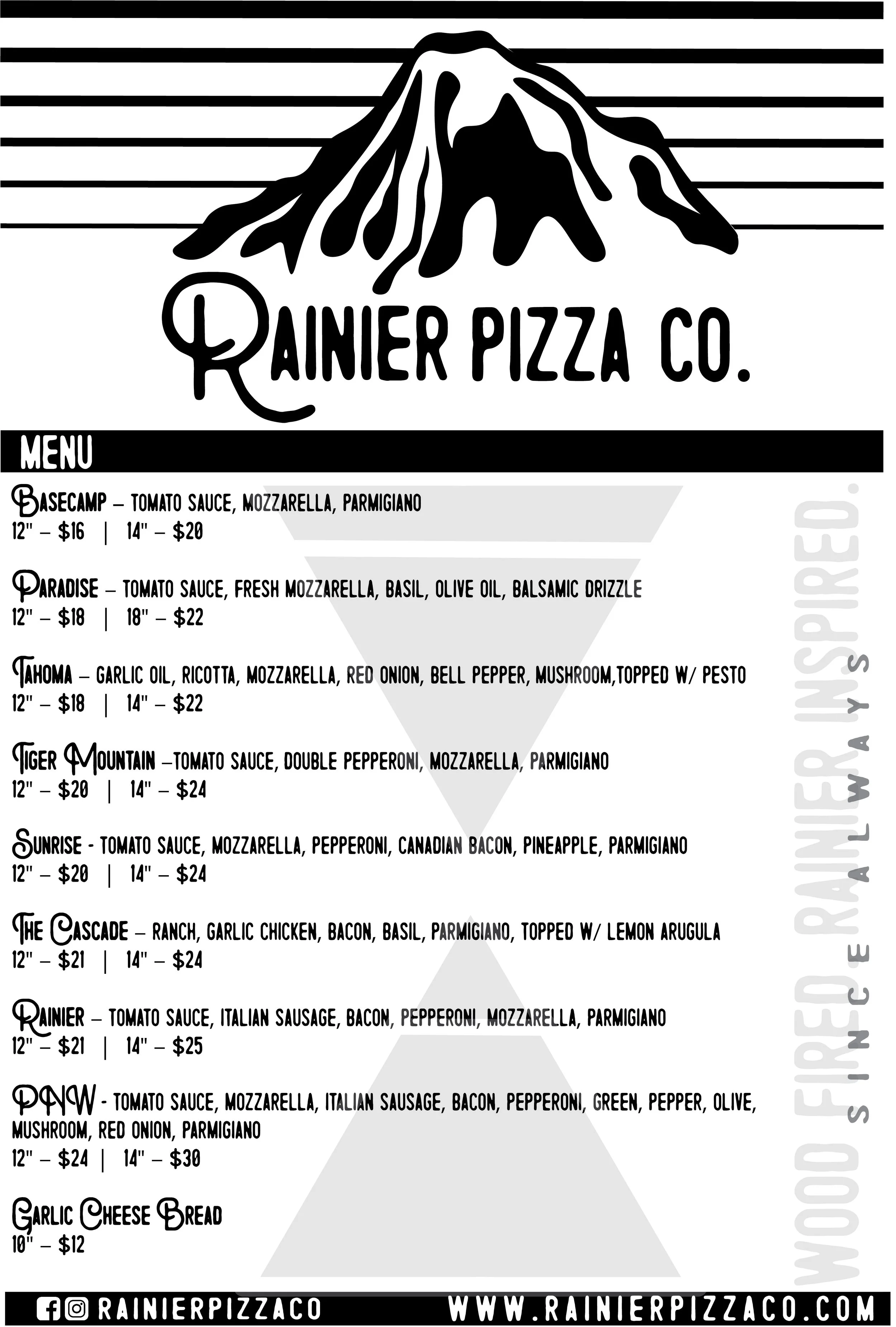 Rainier pizza co. was built on fire, sweat, and a deep respect for where we come from. every pizza we make is a nod to the mountain—wild, rugged, and unapologetically real.